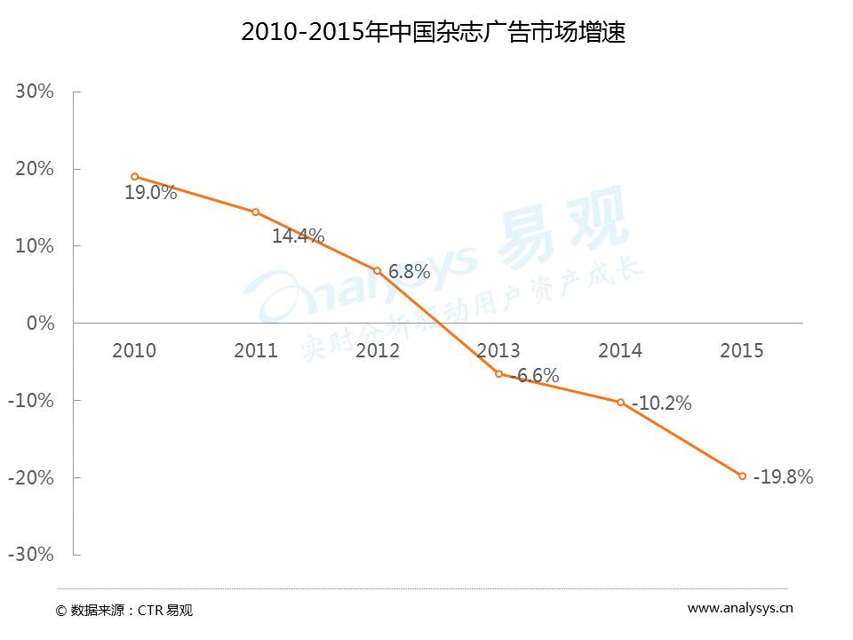 数据显示,2013年中国杂志广告市场增速已为负值(-6.6%),到2015年增速为-19.8%。杂志与报纸一样,寻求线上运营转型。销量方面也在下滑,2014年中国杂志发行总印数为30.9亿册,同比下滑5.4%。