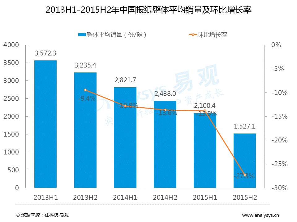 2015H2中国报纸整体销量环比下滑27.3%