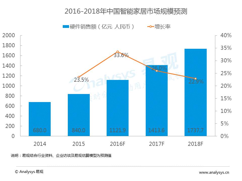 易观数据显示,2016年中国智能家居市场规模超过千亿达到1121.9亿元,增长率为33.6%。2016年中国物联网市场规模将达到9689亿元,接近万亿市场规模。物联网即是人与人、人与物、物与物都实现互联互动,一切物体都可以发送和接收信息。物联网的到来使得万物皆屏实现。