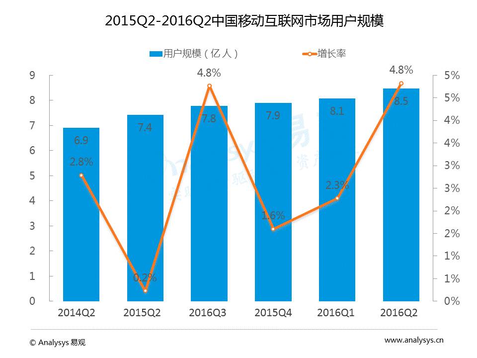 2016Q2移动互联网用户规模达到8.5亿;市场规模达12943.5亿元