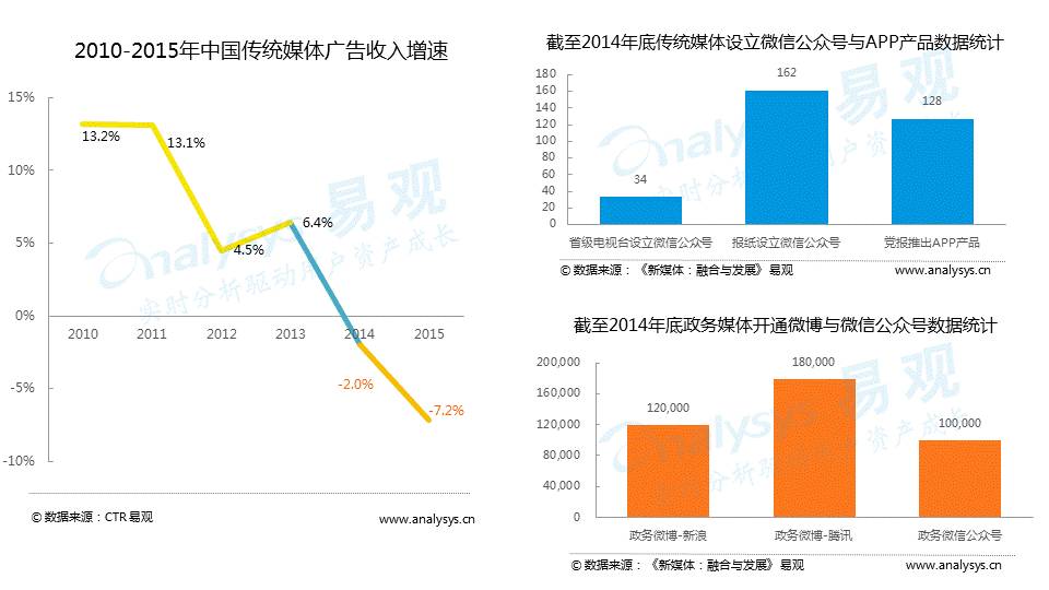 数据显示,2014年中国传统媒体广告收入增速为-2.0%,更在2015年达到-7.2%。2014年被称为“媒体融合元年”,上线“两微一端”成为传统媒体发展融合路径。截至2014年底,全国省级电视台中有34家设立微信公众号,162家报纸设立微信公众号,128家党报独立推出APP产品。同时可以看到,政务媒体纷纷开通微博和微信公众号。