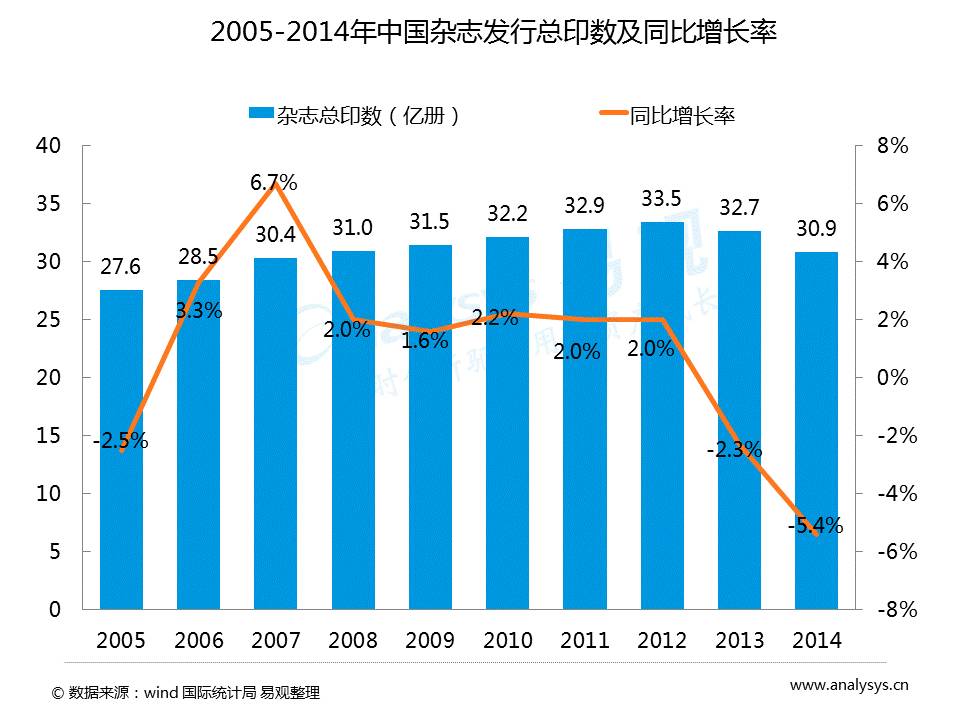 2014年中国杂志发行总印数同比下滑5.4%