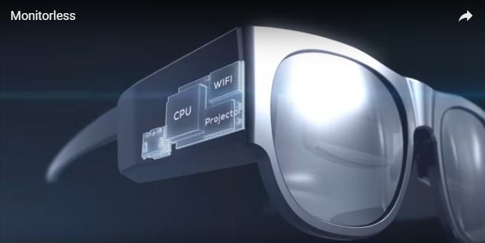 Monitorless是一款远程控制的VR/AR产品,包括一副类似于太阳镜的特殊眼镜。它可以使用户通过智能手机和PC观看视频等内容,而不需要显示器。