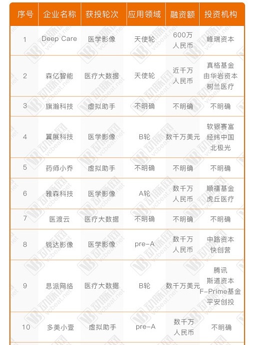 在这次统计的10家融资企业中有9家都获得融资,当然从事医疗影像的公司不仅仅这10家,还有百度、阿里云、科大讯飞等上市企业,这里就没有计算在内。