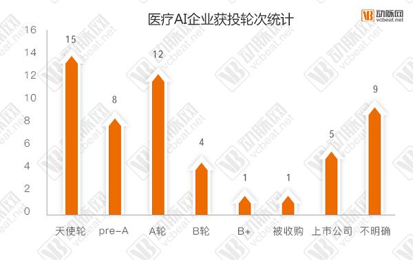 从融资轮次来看,大部分医疗人工智能企业都处在A轮以前,最多也就是做到B轮,几家上市企业是将人工智能技术应用在医疗而不是依靠人工智能技术发家的。在统计的50家创业公司中(不包含上市公司),获得融资的24家,几乎占据一半,医疗人工智能创业企业共融资22.355亿人民币(数千万、数百万按照1000万、100万计算),融资最多是碳云智能A轮10亿人民币。