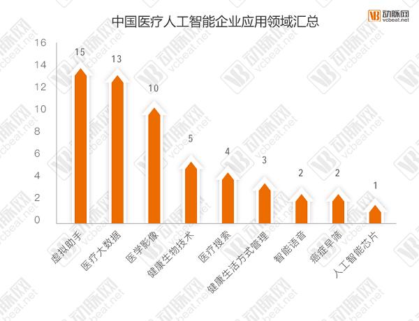 在动脉网统计的55家企业中,动脉网将其划分为9个领域。从事虚拟助手、医疗大数据、医学影像的企业最多。其中虚拟助手包括ET医疗大脑、百度医疗大脑、科大讯飞这些通用性医生助手,可在疾病风险预测、医学影像诊断、精致治疗方案、药效挖掘、新药研发、疾病监测及健康管理等多个领域,担当“医生助手”,当然虚拟助手也包含有若水医生、半个医生、多美小壹等这样的服务、导诊机器人。
