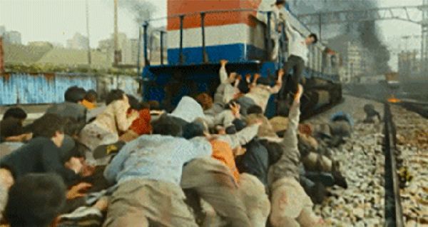 以及,如果你看过丧尸大片《釜山行》,就会发觉《速8》里“丧车”们奔涌而来的这一幕,怎么跟丧尸军团如此相像(下图为动图,请在PC端查看)……