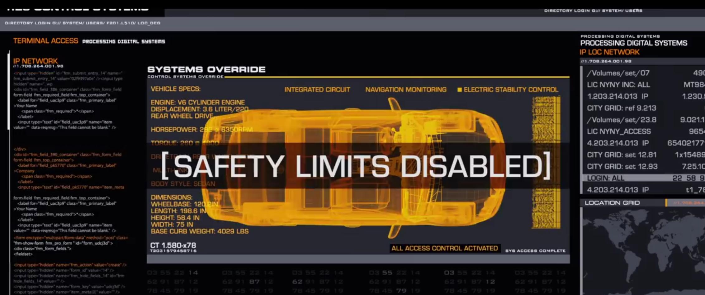 Safety Limits Disabled(下图),你可以理解为“汽车的安全限值(即一个限定的安全范围)已经失效(禁用)”。也就是说,被黑客攻击后,汽车的控制权不能再随意切换,而是完全被电脑掌控。