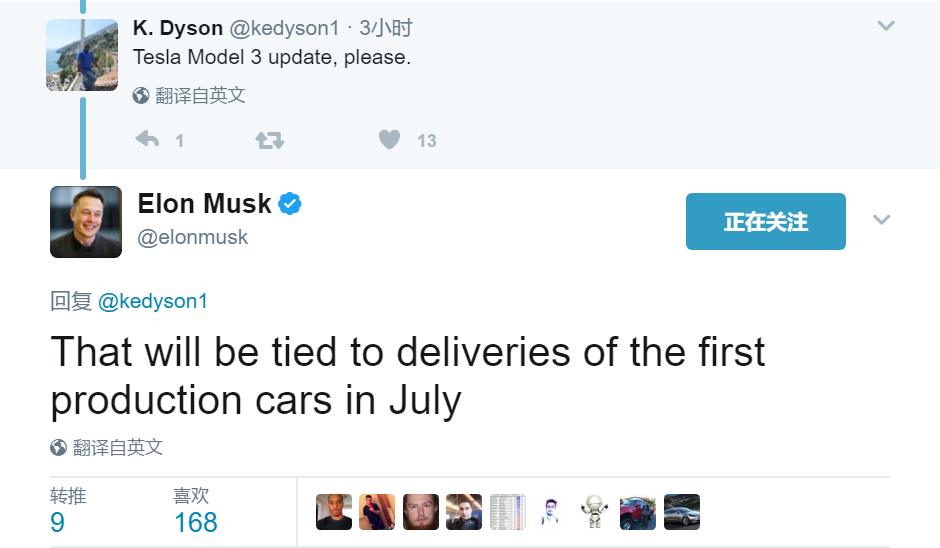 最后是关于新一代车型特斯拉Model 3的消息,Musk重申了首批Model 3将在7月份量产。