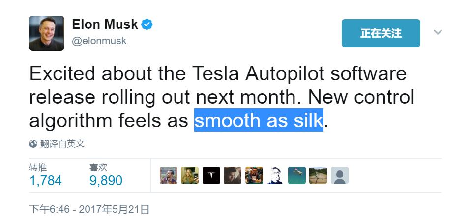 北京时间5月21日下午,Musk发表Twitter称“非常期待下个月即将推送的特斯拉Autopilot软件更新。新控制算法下的Autopilot行车体验给人感觉如丝绸般顺滑。”