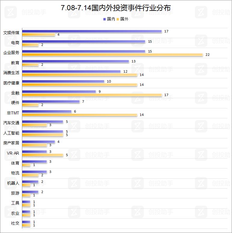 本周创投助手共收录国内投融资、上市事件134条(包含了新三板和二级市场的数据),其中2家公司上市,14家公司挂牌新三板,战略投资和并购事件共发生23起;有20个行业发生融资,行业分布榜的前3名分别是文娱传媒、电商和企业服务。