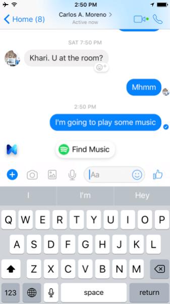 Facebook Messenger的智能助手 M 日前能够根据对话中提及的音乐信息提供 Spotify 通知,提示由各种短语和具体单词触发。例如,在Messenger中输入“播放一些音乐”或“听音乐”,M 将提供 Spotify 中的“查找音乐”。如某一个音乐家被提及,那么如果他们想在Spotify中听这位艺术家,那么M会询问谈话中的人物。这些艺术家特定的Spotify提示可能会出现,即使没有上下文的话,只通过“音乐”或“听”这些短语,也能够触发 Spotify 的提示功能。