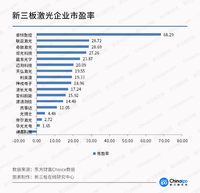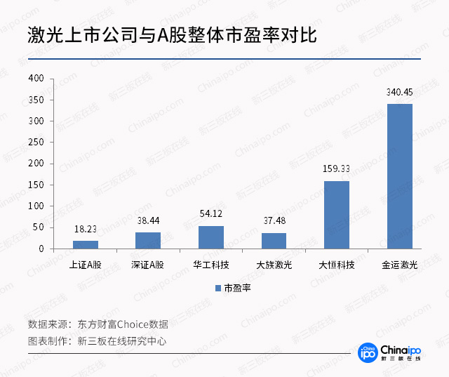 通过对比可知,股价的表现相当给力,那么市场给予它们的估值又是多少呢?根据新三板在线研究中心的统计,截止2017年10月12日,华工科技、大族激光、大恒科技、金运激光的市盈率分别为54.12、37.48、159.33、340.45。同时期,上证A股和深证A股的整体市盈率分别只有18.23和38.44。由此可见,市场对于激光企业的估值还是相当慷慨的。