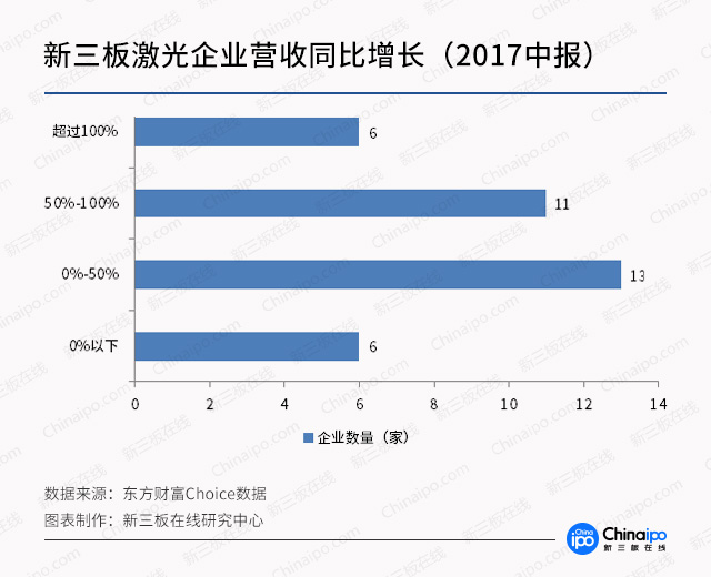 3、2017年二季度36家激光企业中营收同比增速超过100%的有6家,增速在50%到100%区间的有11家,另有13家企业增速处于0%到50%之间。