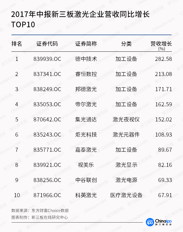 从具体公司的表现来看,2017年中报营收增长最快的十家企业分别是德中技术、睿恒数控、邦德激光、帝尔激光、集光通达、炬火科技、嘉泰激光、视美乐、中谷联创、科英激光。
