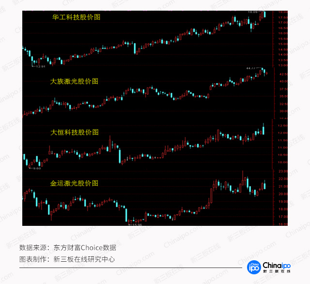 根据A股上激光概念股的表现,新三板在线研究中心挑选了比较有代表性的4家上市公司进行分析。这4家上市公司分别是华工科技、大族激光、大恒科技和金运激光。