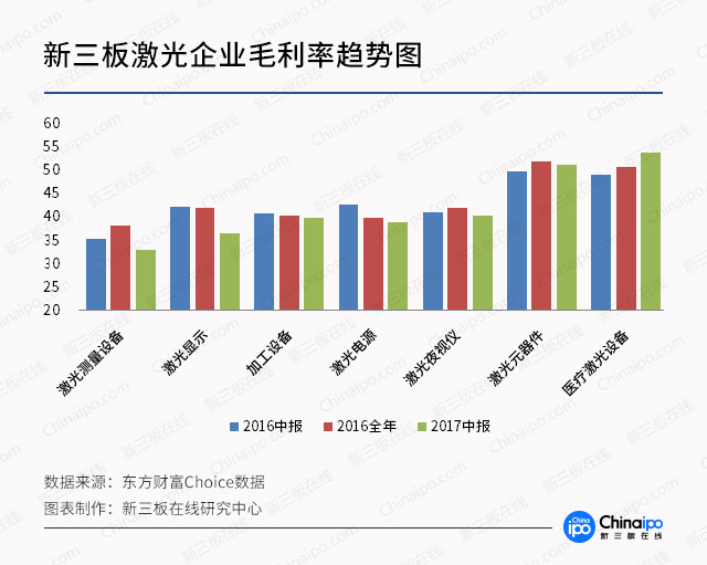 从毛利率的绝对值来看,将最近3期平均毛利率从低到高排序,依次是激光测量设备、激光显示、加工设备、激光电源、激光夜视仪、激光元器件件、医疗激光设备。其中激光测量设备3期平均毛利率为35.48%,在激光7个小类中排名最后。不过即使如此,还是要比新三板整体公司的平均毛利率高出近10个百分点。而排名第一的医疗激光设备的平均毛利率更是高达51.21%,相当于每卖出100元设备,就能赚取51元的毛利,盈利能力相当可观。