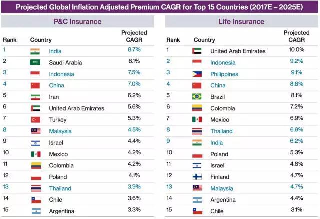 亚洲新兴市场的代表是中国,中国已经步入全球第三大保险市场。其他国家还包括印度、印尼、马来西亚和泰国等。从2017年到2025年,这些国家的保费增长CAGR都保持在5%以上。