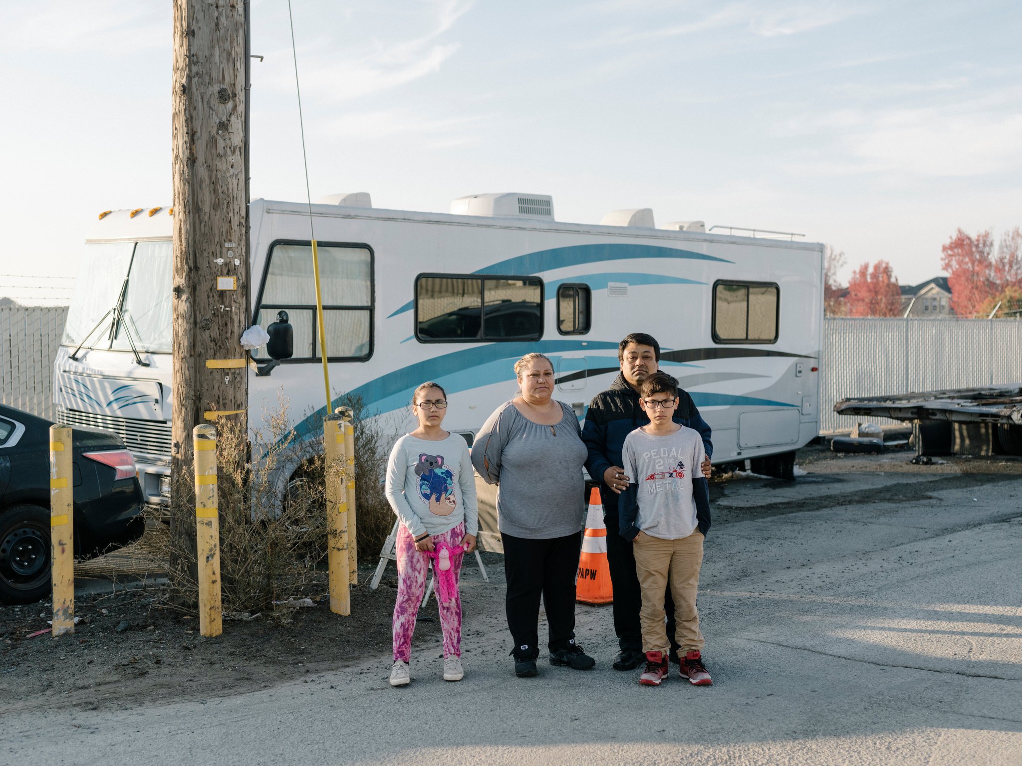 阿德拉·莫拉莱斯(Adela Morales)和阿德里安·博尼利亚(Adrian Bonilla),以及他们的孙辈,他们住在加利福尼亚东帕洛阿尔托的一个房车社区,直到上周被驱逐。