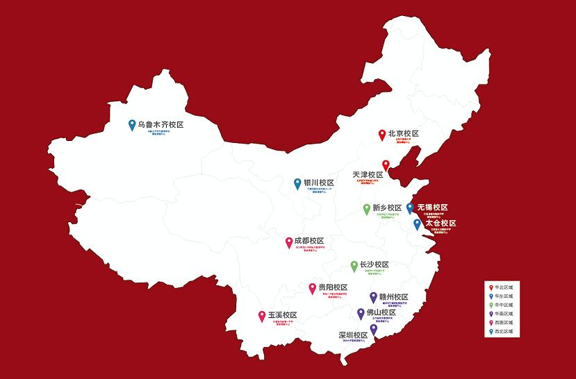 中育贝拉在全国的办学基地可遍及华北、 华东、华中、华南、西南及西北地区,共计14个校区。