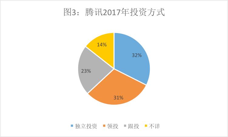 上图展示了腾讯2017年对项目的投资方式,腾讯独立投资的项目只占投资项目总数的32%,和其他机构联合投资的占68%,其中确认由腾讯领投的只有31%,而跟投的比例高达23%。腾讯的这种投资方式,和典型的PE/VC的投资模式比例结构非常相近。