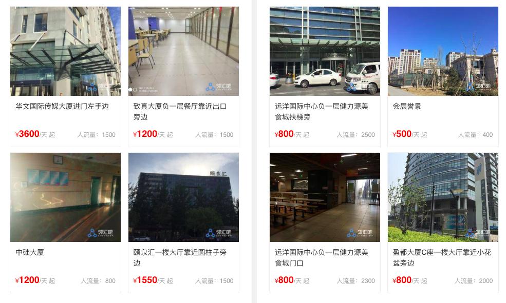 邻汇吧的定位是线下流量交易,平台切入点是为线下品牌推广或零售活动提供闲置场地在线预定。平台上聚集了社区、园区、写字楼、商场、地铁、高铁、机场、景区、游乐场等场地方,有品牌地推或活动需求的企业可以在平台上像在线上网盟采买流量一样预约场地获取线下流量,类似于线下流量场地的SSP。