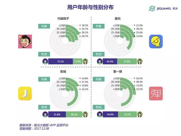 极光大数据显示,即刻、最右、内涵段子、第一弹的用户中,年龄小于 19 岁的仅占 20% 左右,除了内涵段子各个年龄段的用户分布较为均匀之外,其他 3 个App的主流用户群均为 20~24 岁的 90 后。