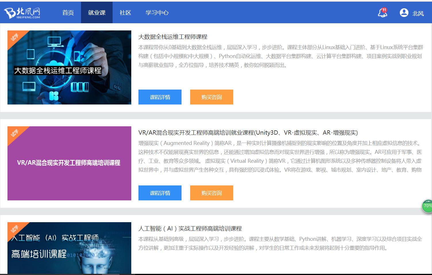为保证课程的品质可控并持续迭代,北风网建立了较为严格的课程研发标准,从需求调研到研发到毕业设计,全程超过 100 项标准化任务。北风网还建立了基于大数据技术的课程需求调研体系,通过大数据技术,北风网进行数据建模,对职位画像、就业前景画像、技能需求点进行切片化分析提炼,有效保障课程研发方向满足市场需求。