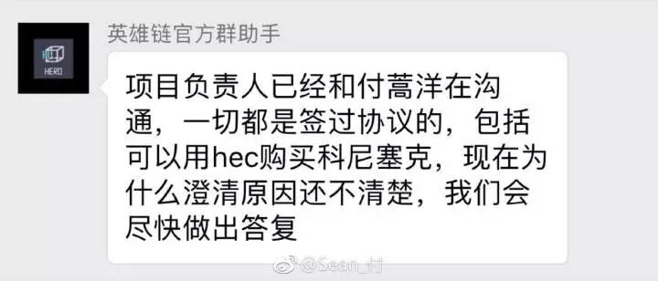 在付嵩洋辟谣前,市场上还流传这样一则消息,投资人可以使用英雄链HEC代币直接购买世界最快超跑科尼塞克。