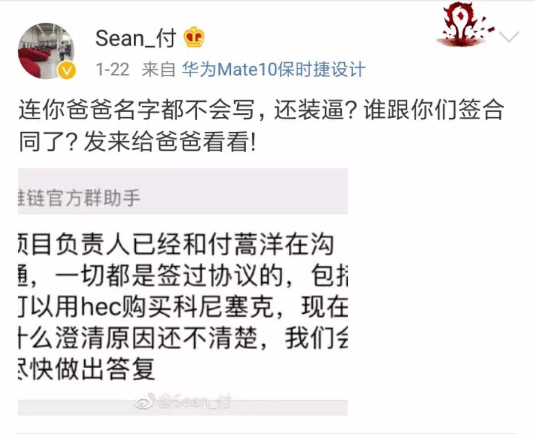 奇怪的是,英雄链官方在被付嵩洋“打脸”后,依然坚持双方已经签过协议。