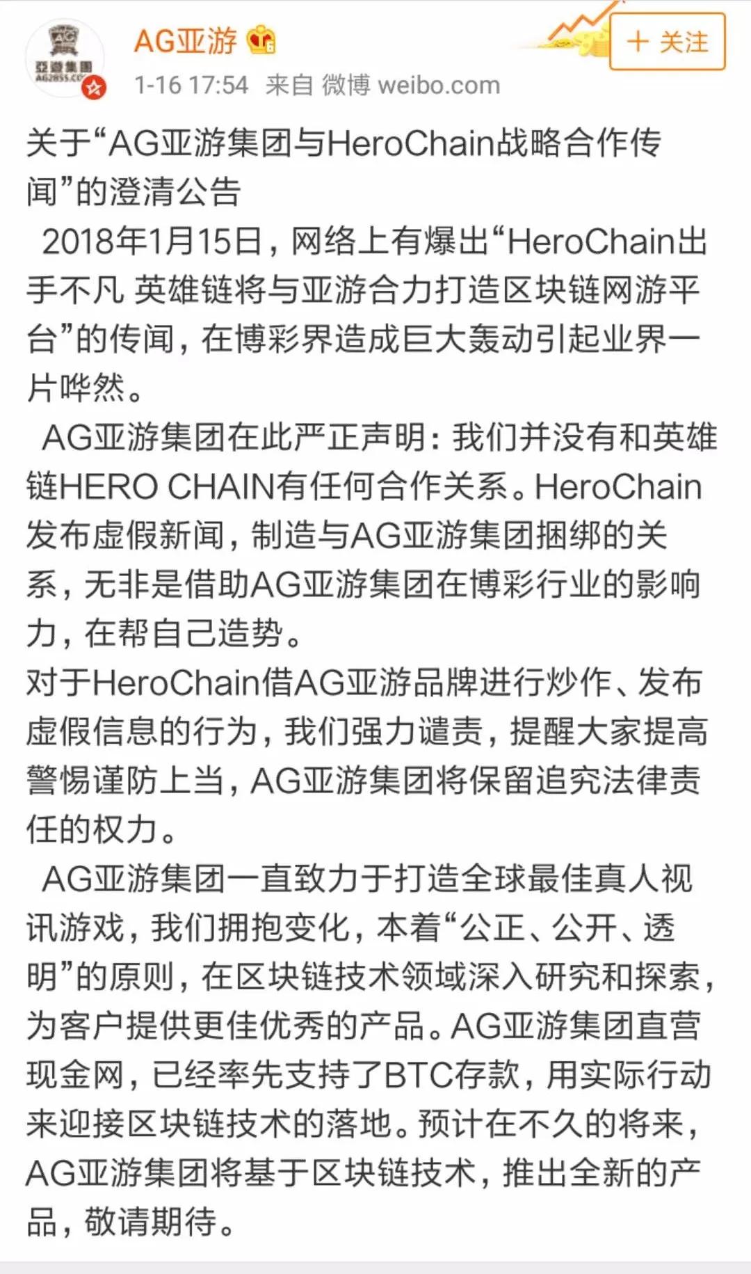 1月16日,AG亚游官方发布其与英雄链战略合作传闻的澄清公告。公告指出,英雄链发布虚假新闻,强行与AG亚游集团进行捆绑。对于这种试图借助AG亚游在博彩行业影响力进行炒作造势的行为,AG亚游表示强力谴责。