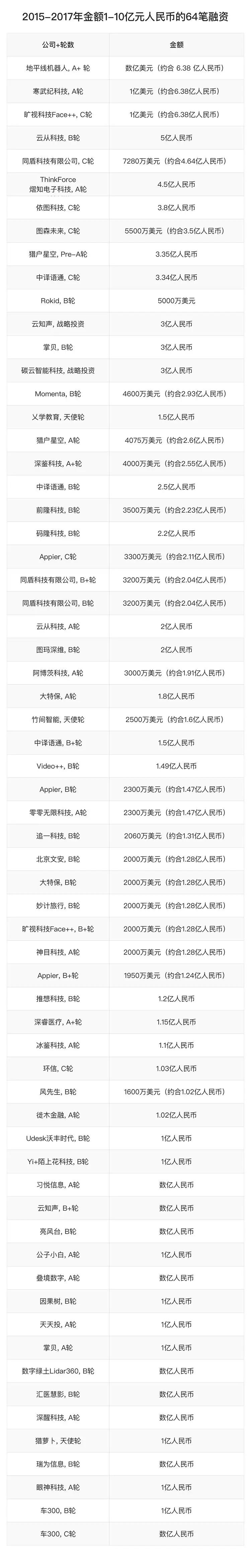 其中,单笔融资在 1 亿 到 10 亿人民币规模达到 64 笔,单笔融资超过 10 亿人民币规模的 5 笔包括商汤科技的 B轮、C 轮、旷视科技 C+轮、出门问问 D 轮以及碳云智能 A 轮。