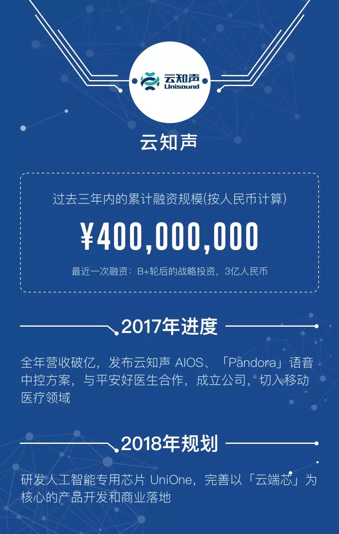 在 2015 年完成 1500 万 A 轮融资的得意音通,主推「声纹识别技术」支持的「声密保」,产品已经应用在社保、建行手机与电话银行以及万科酒店身份认证系统。有消息称,公司预计在 2018 年进行新一轮融资,融资规模也在亿元水平。