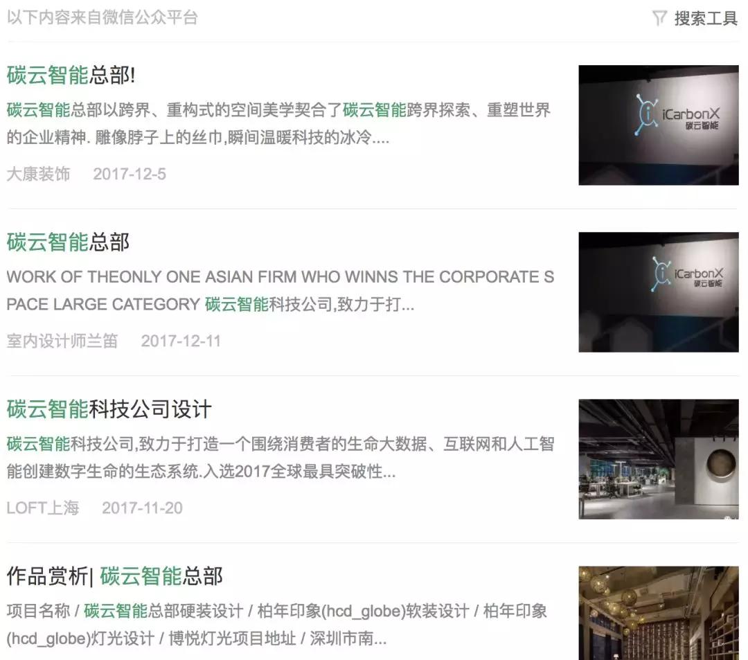 最后,如果你在微信里搜索碳云智能,得到最多的结果是…… 「碳云智能总部室内设计作品赏析」。
