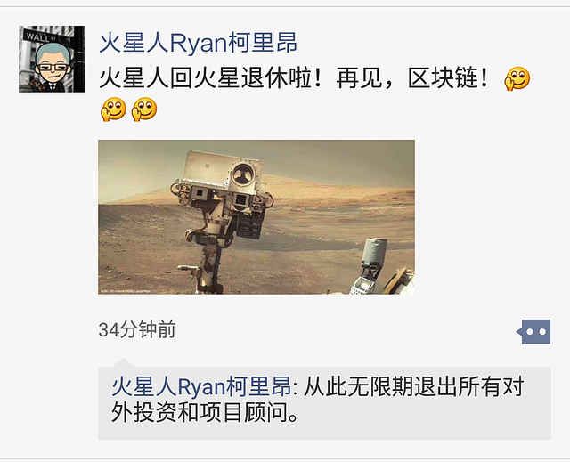 曾经,作为2014年币圈十大风云人物的第七,火星人被认为:“一切比特币黑遇到火星人都有可能被其洗脑”。然而,最近其在朋友圈公布向区块链道别:“火星人回火星退休啦!再见,区块链!”