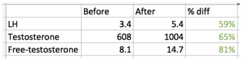 我公开了所有的数据。它们展示了众多益处,3-4倍身体脂肪被减掉、非常高的运动性能(VO2Max ~70),可以不予重视的炎症、睾丸激素增加80%上,以及许多渐趋衰老的生命特征的改善。
