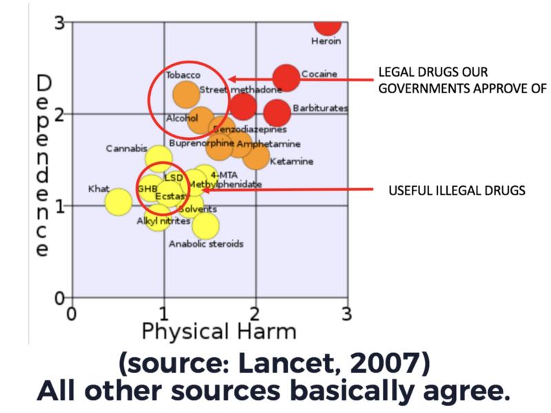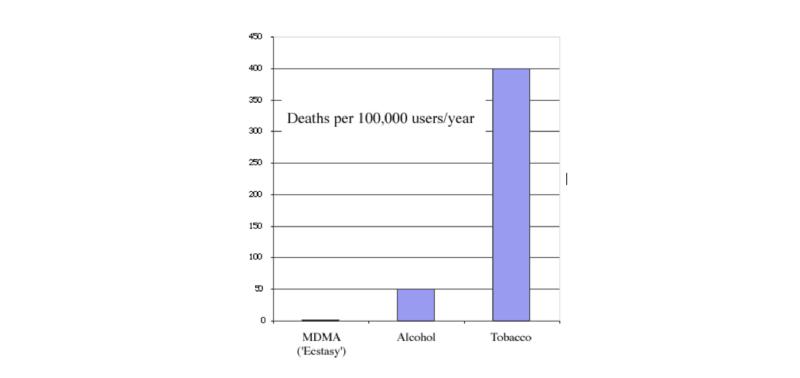 科学研究表明,二亚甲基双氧苯丙胺的风险似乎远低于酒精和烟草的风险(这里有几项研究,其中的观点对任何看过这些文章的人都是显而易见的)。食品及药物管理局即将批准它用以治疗创伤后应激障碍,并说这是一个“突破”。