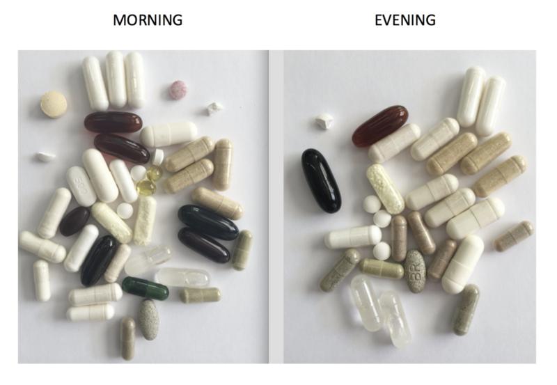 我每天服用大量补充品,约有50片(如上面图片所显示)。它们基本上是超级安全的东西(如浓缩大蒜),能带来好处。