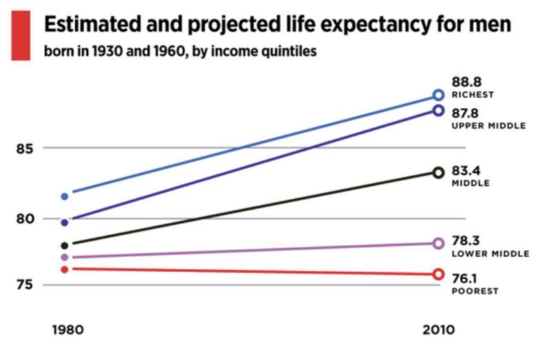 收入已经导致不平等,而且情况日益加剧。根据上面的统计数据,我们可以推测出,1985年出生且收入占据前1%的男性的预期寿命至少是95—100岁,对于女性来说,这个数字甚至更高。