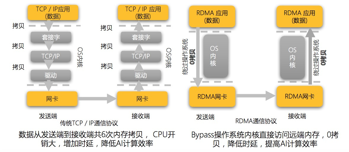 星云RDMA技术的原理及其与TCP/IP架构的对比如下图所示:
