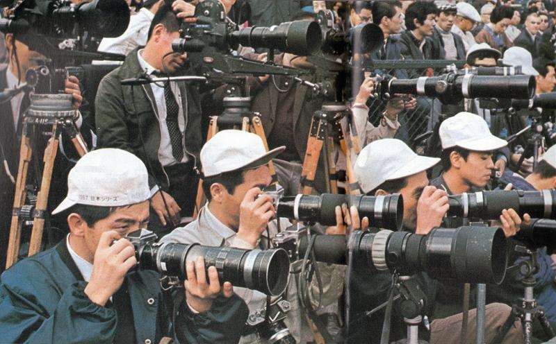 注解:这来自1964年的东京奥运会。里面只有尼康相机而且请留意这些相机的一致性。顺便说一句,带有镀铬环的镜头是85-250mm镜头,相当于今天的80-200专业变焦。这是在1959年引入的,是日本制造商的第一款商用变焦镜头。