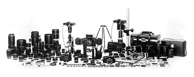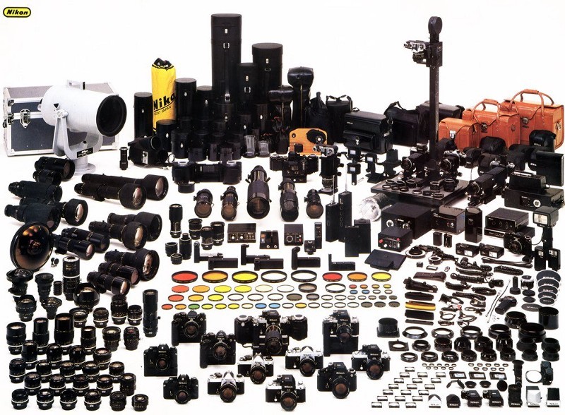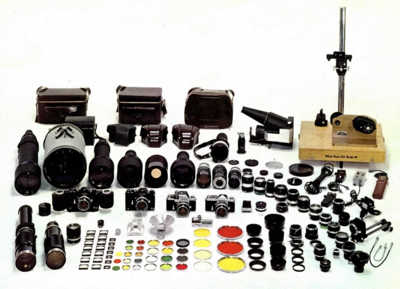 (2)注解:几个月后尼康推出了F2系统。这款产品完全是压倒性的。镜头之多从6mm(左边那个巨大的鱼眼头,有着220°的超视角)一直做到2000mm(左上角看起来像天文望远镜一样的东西,这是迄今为止最长焦距的镜头)。还有佳能想到没想过的各种附件。