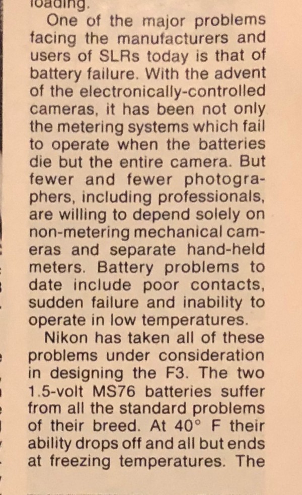 注解:这是1980年F3发布时的评测,你可以看到其中在电池上面费了多少笔墨!但还有很多东西上面没说,比如驱动相机的电动机需要8节AA电池,但是在寒冷天气无法工作……