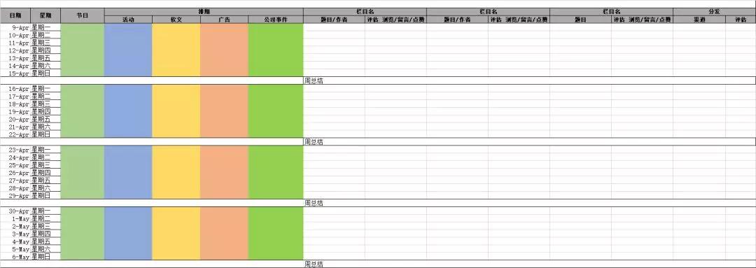 设定模板之前,先列出重要节日,如果你有广告或是公司化运作,加上广告或重大事件排期,先定位自己的内容板块,设定责任人和评估标准,预先设定分发渠道,将传播效果最大化。每周或每月进行内容总结,及时调整发布策略。