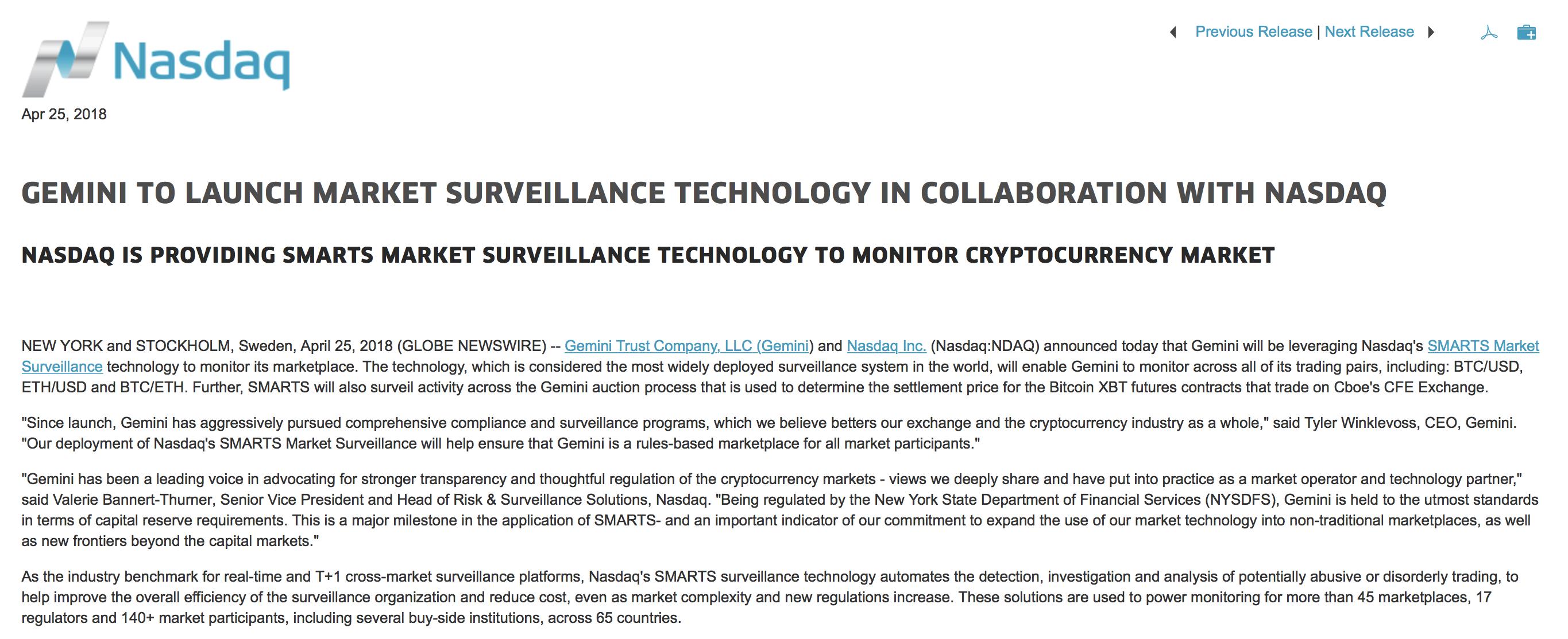 4月25日,纳斯达克与比特币交易平台Gemini宣布合作,落地其 SMARTS 市场监视技术,监督Gemini平台全部数字资产。