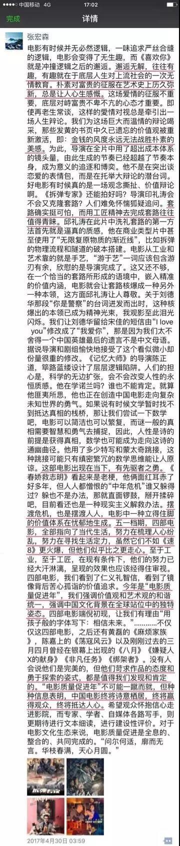 犹记得去年五一档期,在4月30日的凌晨,时任国家新闻出版广电总局副局长的张宏森在朋友圈内发布了千字长文来点评当时档期内上映的《喜欢你》、《拆弹专家》、《记忆大师》以及《春娇救志明》。在张宏森看来,这四部电影虽然票房不如《速度与激情8》火爆,但它们似乎比之更走心,让中国电影人有理由“相信未来”。