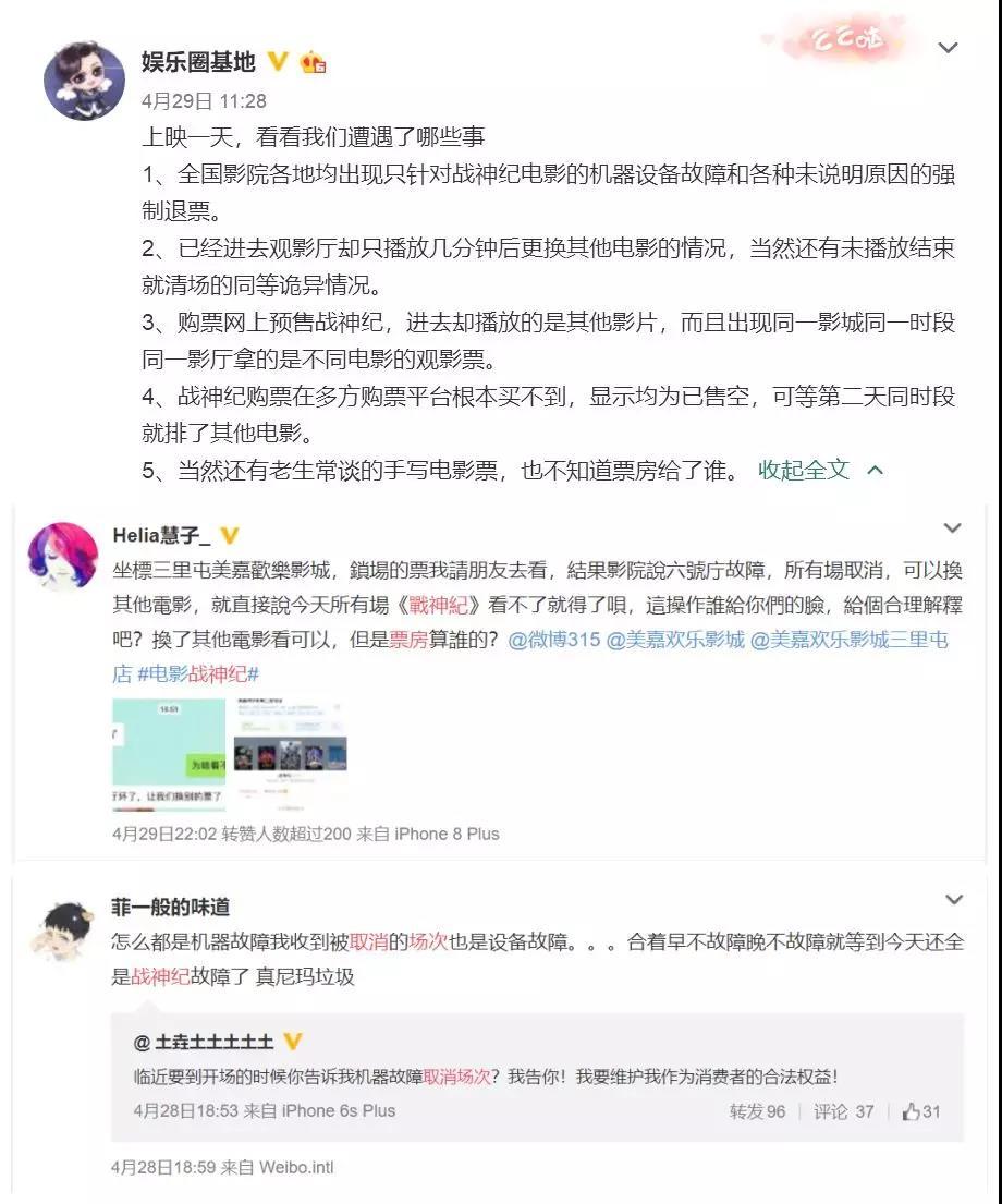 除此之外,《战神纪》还在多地被曝出出现放映事故以及被替换电影票等,各片方的力量已经不是集中在如何做好自己的宣发营销,为同档期竞争影片制造不痛快,在2018年的五一期间,从行业的潜规则变成了明目张胆的作恶。
