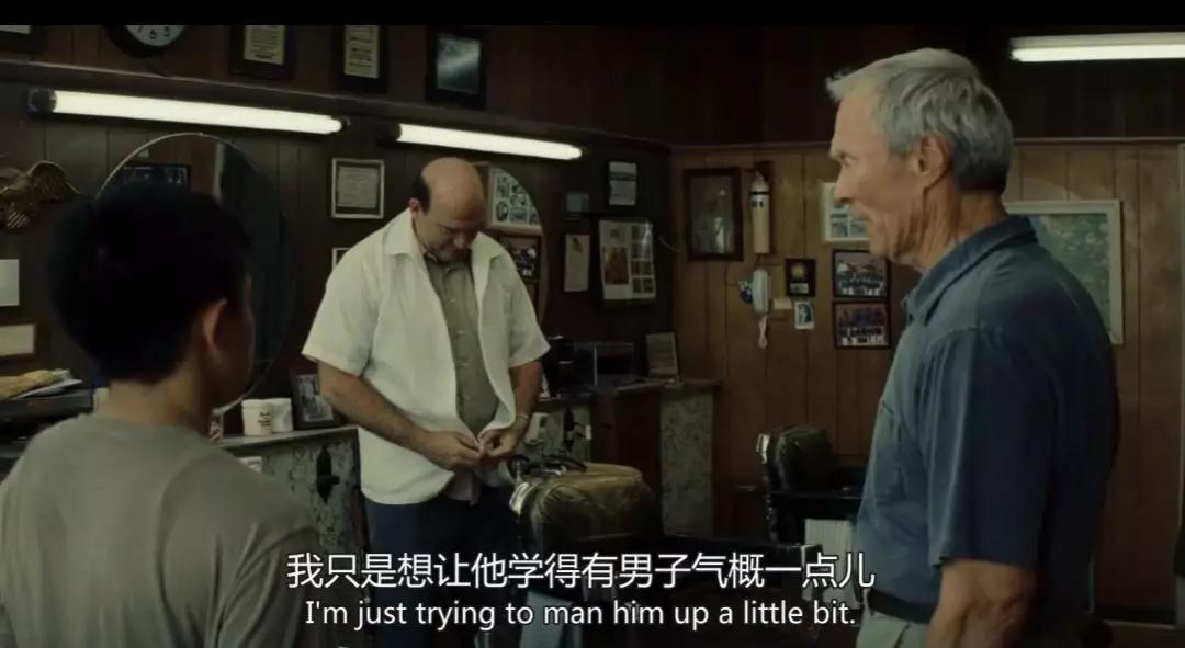 并不是所有给人理发的男性都会被视为娘炮。电影《老爷车》里,硬汉沃尔特想培养亚裔少年涛的阳刚之气,就带他去了自己常去的理发店,在那里学习「男人之间的对话」。