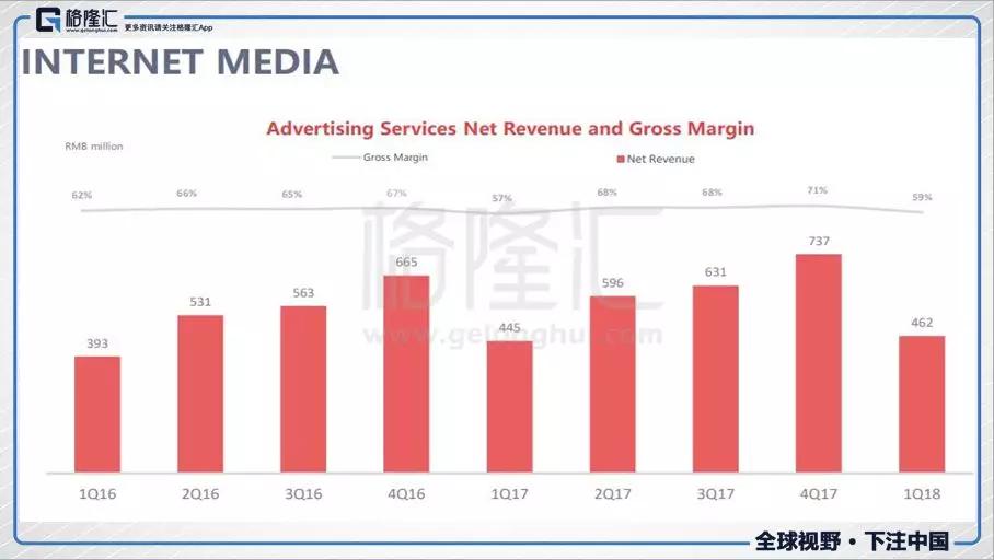 本季度,网易的互联网媒体业务营收达4.62亿元,同比增加4%,环比下降37%。互联网媒体业务的毛利率为59%,略高于去年同期的57%,明显低于2017年四季度的71%。