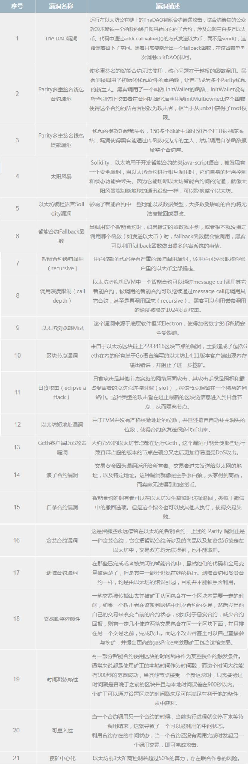 以太坊主要安全漏洞整理(表格来自雷锋网)